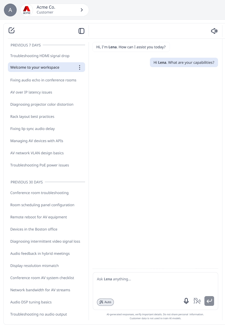 Lena is built to assist overstressed support teams, adding layers of efficiency, intelligence and autonomy to workspaces. Purpose-built for the AV / UC ecosystem, Lena adapts to the specifics of your workspaces with agentic AI.